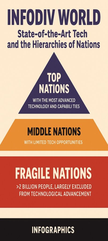 تتشكل اليوم أمام أعيننا “طبقية جديدة” لا تقوم على الثروة الفردية أو المكانة الاجتماعية فحسب، بل على موقع الدولة داخل سلم الفرص التكنولوجية. إنها طبقية الدول بعلاقتها بعناصر الفائض والاستثمار والمعرفة والبنية الرقمية والتصنيع المتقدم والحوسبة السحابية، وهي طبقية تهدّد بترك كُتلة بشرية تقارب ربع العالم خارج السباق خلال العقد المقبل إن بقيت قواعد اللعبة على حالها. تتقاطع هنا ثلاث حقائق صلبة: أولًا، إن نحو ملياري إنسان يعيشون في سياقات هشّة أو عالية الهشاشة وفق تصنيف منظمة التعاون والتنمية (أكثر من 60 سياقًا)، أي ما يقارب 25% من سكان العالم، لكنهم يضمّون قرابة 72% من الفقراء المدقعين، ما يعني أن الهشاشة لا تُقصي عن السياسة فحسب بل عن الاقتصاد الرقمي أيضًا؛ في المقابل، تعتمد لوائح البنك الدولي وصندوق النقد على تعريف أضيق للهشاشة والنزاع، فتقدّر الكتلة السكانية في البلدان الهشّة والمتأثرة بالنزاع بحوالي مليار إلى 1.1 مليار إنسان اليوم مع اتجاه أن يُتركز 60% من الفقر المدقع في هذه البيئات بحلول 2030، والفارق بين الرقمين يعود لاختلاف المنهج لا لتناقض الواقع الذي تشير إليه كلا القراءتين: هناك كتلة بشرية هائلة خارج شروط التراكم التقني.