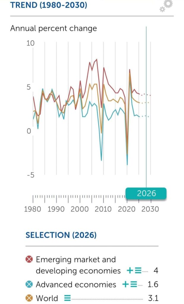 وهذا ما كانت قد اشارت اليه مديرة صندوق النقد الدولي كريستالينا جورجيفا، في مؤتمر العلا بتاريخ 8 فبراير2026 لاقتصادات الأسواق الناشئة، في المملكة العربية السعودية، بأن معدلات النمو في الأسواق الناشئة – التي بلغت أكثر من 4% هذا العام – قد تجاوزت بفارق كبير معدلات النمو في الاقتصادات المتقدمة، والتي بلغت حوالي 1.8%. وتستمر حصتهم في الاقتصاد العالمي بالارتفاع، حيث تضاعفت منذ عام 2000 لتتجاوز 56%.