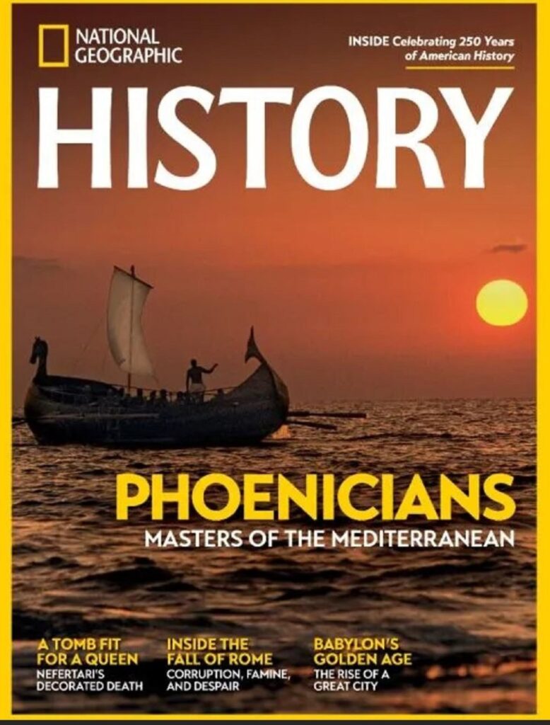المجلة الأَميركية العلْمية الشَهرية “ناشيونال جيوغرافيك” (تأَسست في واشنطن قبل 138 سنة – صدَر عددها الأَول في أَيلول/سبتمبر 1888)، خصَّصت عدَدها المزدوج (تموز-آب/يوليو/أُغسطس 2025) لهذا الموضوع، وعَنْوَنَتْهُ على الغلاف: “الفينيقيون أَسياد المتوسط”. كتبَه الاختصاصيُّ الإِسبانيُّ في علم الآثار ودراسات الشرق الأَدنى وجذور الفينيقيين: البروفسور جوردي ڤيدال (حاليًّا: أُستاذ التاريخ القديم لدى جامعة برشلونة المستقلَّة).